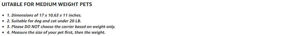 • 3.SUITABLE FOR MEDIUM WEIGHT PETS: Dimensions of 17 x 10.63 x 11 inches, suitable for dog and cat under 20 LB. Size Limits: 15″ (Length); 9″ (Height). Please DO NOT choose the carrier based on weight only, measure the size of your pet first, then the weight.