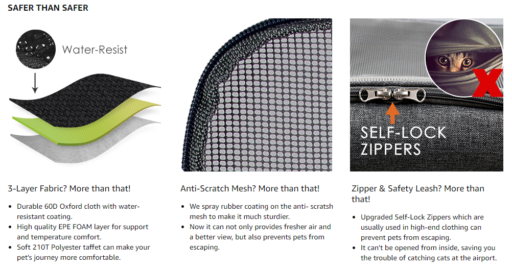 2.ULTRA-SAFE, EXTRA DURABLE- UPGRADED to REINFORCED Polyester & CLAW-DEFENSE MESH on top & 4 sides ensures your pet has ample VENTILATION and AIRFLOW & it WON’T TEAR like flimsy, cheap carriers while MINI ZIPPER BUCKLES ensure your pet stays tucked safely inside.