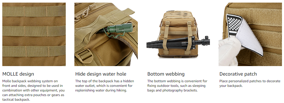 • 3.MOLLE modular design: The Molle backpack webbing system on the front and side is designed to be used in combination with other equipment. You can attach additional sachets or equipment as tactical backpacks; such as water bottle bags, walkie-talkie bags, first aid bags, flashlight bags, sundries bags, and sleeping bags and mats.