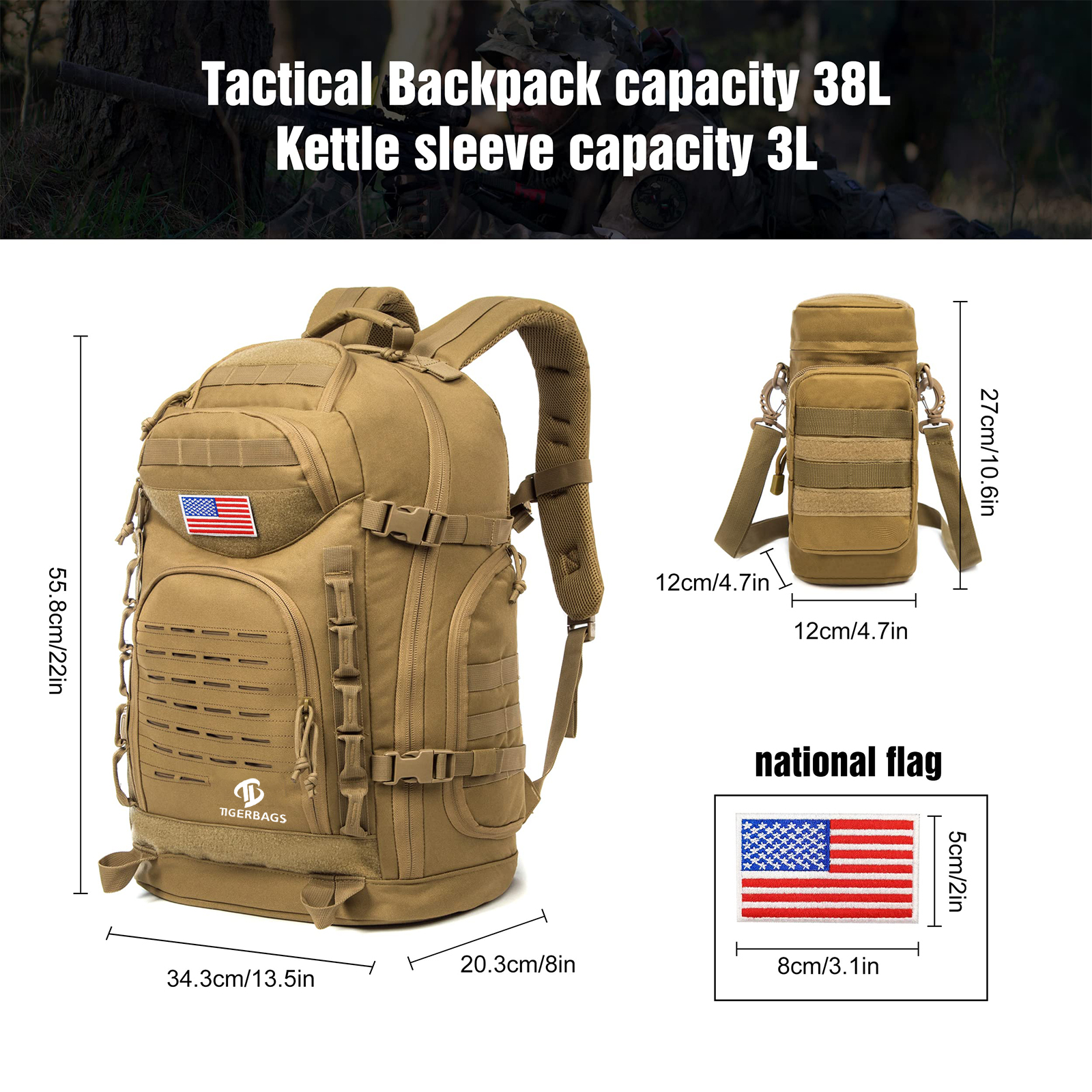 2. Quality fabric: The Military tactical backpack is constructed of a heavy and durable 100% polyester waterproof lining for greater stretch and tear resistance. Meanwhile, the military backpack comes with a 3L military water bottle bag and a removable flag patch. The water bottle bag is made of durable 800D Oxford cloth.